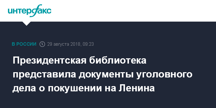 Москва. 29 августа. INTERFAX.RU - Президентская библиотека оцифровала хранившиеся в Государственном архиве РФ документы уголовного дела о покушении на Владимира Ленина, совершенном 30 августа 1918 года, сообщила во вторник пресс-служба учреждения.