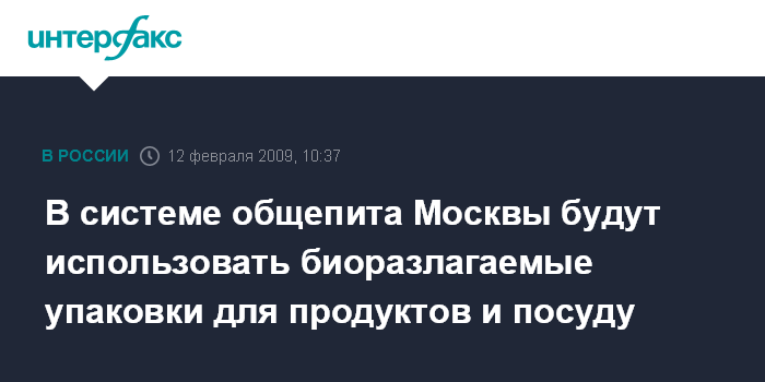 Москва. 12 февраля. INTERFAX.RU - Столичные власти приняли решение о проведении эксперимента по внедрению в системе общественного питания биоразлагаемых упаковок для продуктов и одноразовой посуды, заявил руководитель департамента природопользования и охраны окружающей среды Леонид Бочин на заседании актива департамента в четверг.