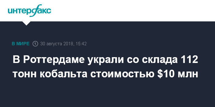 Москва. 30 августа. INTERFAX.RU - В результате ограбления склада в Роттердаме, крупнейшем грузовом порту Европы, злоумышленники похитили 112 тонн кобальта на общую сумму свыше $10 млн.