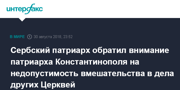 Москва. 30 августа. INTERFAX.RU - Патриарх Сербский Ириней обратился к Вселенскому патриарху Варфоломею с открытым письмом, в котором заявил, что, хотя Константинопольский патриархат - Церковь-Мать для Киева и Москвы, это не дает ему права вмешиваться в их дела.