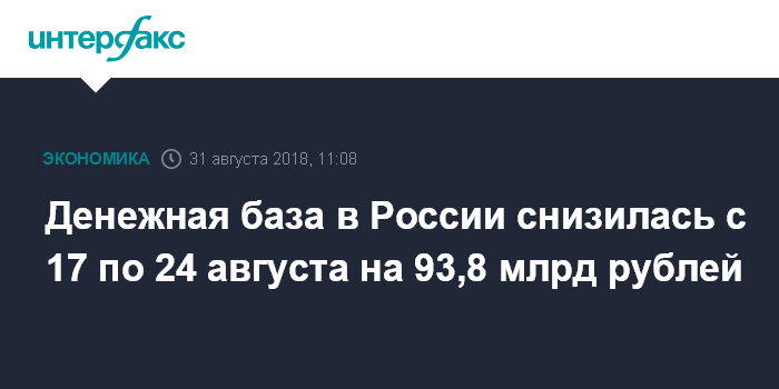 На 17 августа денежная база в России равнялась 10450,6 млрд рублей. Таким образом, за период она снизилась на 0,9%, или на 93,8 млрд рублей.