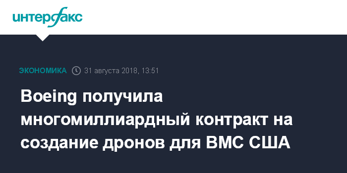 Москва. 31 августа. INTERFAX.RU - Военно-морские силы США заключат контракт с Boeing на разработку дронов для дозаправки самолетов палубной авиации, пишет Dow Jones.