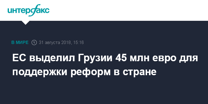 Москва. 31 августа. INTERFAX.RU - Европейская комиссия подписала с Грузией соглашение об оказании стране макрофинансовой помощи (AMF) в 45 млн евро для покрытия части ее внешних потребностей и поддержки экономических реформ в стране, сообщает в пятницу пресс-служба ЕС.