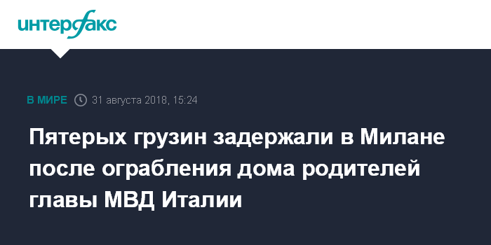 Москва. 31 августа. INTERFAX.RU - Полиция Милана подтверждает задержание пятерых граждан Грузии по подозрению в ограблении дома родителей министра внутренних дел Италии Маттео Сальвини, сообщают в пятницу грузинские СМИ.