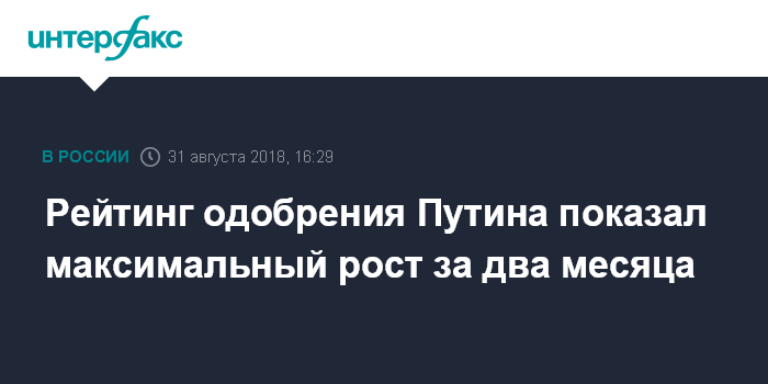 Москва. 31 августа. INTERFAX.RU - Рейтинг одобрения деятельности президента РФ Владимира Путина продемонстрировал на прошлой неделе максимальный рост за прошедшие два месяца, свидетельствуют данные опроса ВЦИОМ, поступившие в пятницу в "Интерфакс".