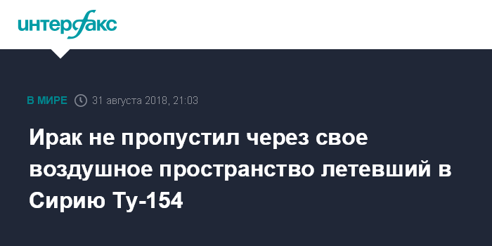 Москва. 31 августа. INTERFAX.RU - Самолет Воздушно-космических сил (ВКС) России Ту-154М, летевший в Латакию (Сирия), не был допущен в воздушное пространство Ирака, сообщает в пятницу арабское интернет-издание "Аль-Масдар".