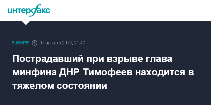 Москва. 31 августа. INTERFAX.RU - Министр доходов и сборов самопровозглашенной Донецкой народной республики Александр Тимофеев, пострадавший при взрыве в центре Донецке, находится в больнице в тяжелом состоянии. Об этом сообщил в пятницу заместитель командующего оперативным командованием ДНР Эдуард Басурин.