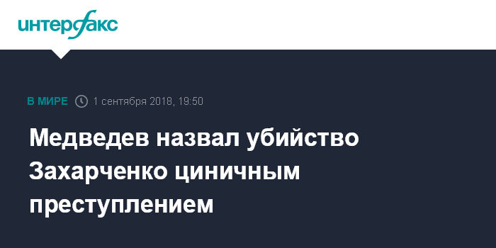 Москва. 1 сентября. INTERFAX.RU - Премьер-министр России Дмитрий Медведев выразил глубокие соболезнования в связи с трагической гибелью главы самопровозглашенной Донецкой народной республики Александра Захарченко, сообщается на сайте правительства РФ.