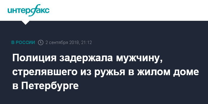 Москва. 2 сентября. INTERFAX.RU - Полицейские задержали петербуржца, открывшего стрельбу из ружья из квартиры жилого дома в Московском районе города, сообщили "Интерфаксу" в пресс-службе ГУ МВД по Петербургу и Ленинградской области в воскресенье.