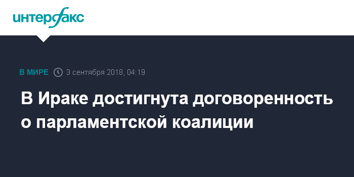 Москва. 3 сентября. INTERFAX.RU - Двум иракским политическим конкурентам - премьеру Хайдеру аль-Абади и богослову Муктаде ас-Садру удалось договориться о создании в парламенте коалиции, которая сможет сформировать правительство станы, сообщили СМИ из Багдада.