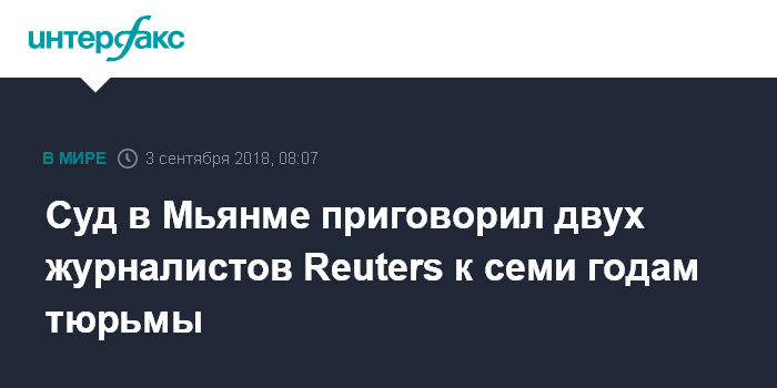 Москва. 3 сентября. INTERFAX.RU - Два корреспондента британского информационного агентства Reuters приговорены судом Мьянмы к семи годам тюремного заключения, сообщил телеканал CNN.