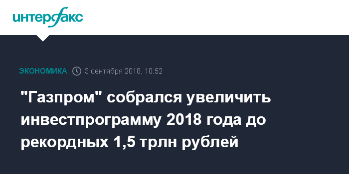 "Газпром" собрался увеличить инвестпрограмму 2018 года до рекордных 1,5 трлн рублей