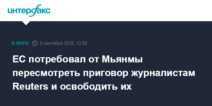 Москва. 3 сентября. INTERFAX.RU - Обвинительный приговор в Мьянме журналистам агентства "Рейтер" Ва Лону и Кья Со Оо, осужденным на семь лет за разглашение государственной тайны, подрывает свободу СМИ, право общественности на получение информации и принцип верховенства права в Мьянме. Об этом заявил официальный представитель Европейской внешнеполитической службы (ЕВС).