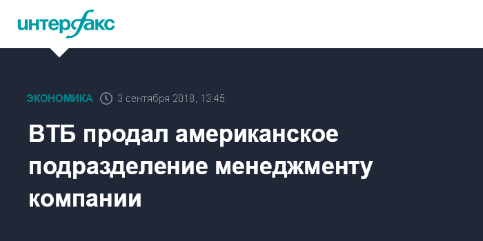 Москва. 3 сентября. INTERFAX.RU - Группа ВТБ продала американское подразделение VTB Capital Inc менеджменту этой компании, которая теперь станет самостоятельным игроком на рынке.