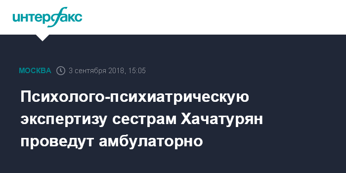 Москва. 3 сентября. INTERFAX.RU - Психолого-психиатрическая экспертиза в отношении сестер Хачатурян, обвиняемых в убийстве отца, будет проводиться амбулаторно, сообщил "Интерфаксу" адвокат одной из них Ярослав Пакулин.