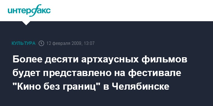 Москва. 12 февраля. INTERFAX.RU - Фестиваль артхауса "Кино без границ", на котором будет представлено независимое американское, европейское и азиатское кино, пройдет в Челябинске с 18 по 25 февраля.