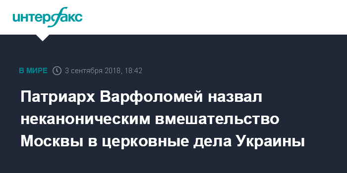Москва. 3 сентября. INTERFAX.RU - Патриарх Варфоломей настаивает на праве Константинопольской церкви решать украинскую церковную проблему без участия Московского патриархата.