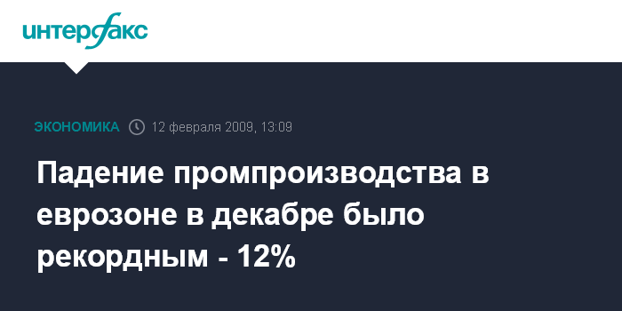Москва. 12 февраля. INTERFAX.RU - Объем промышленного производства в еврозоне в декабре упал на 12% относительно того же месяца прошлого года, что стало рекордным снижением с начала отслеживания этих данных в 1986 году, сообщило агентство Bloomberg со ссылкой на данные Статистического управления Европейского Союза. Аналитики ожидали уменьшения показателя на 9,5%.