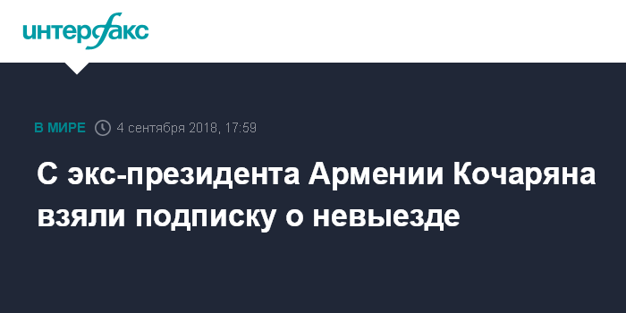 Москва. 4 сентября. INTERFAX.RU - Специальная следственная служба Армении во вторник избрала меру пресечения в отношении экс-президента страны Роберта Кочаряна в виде подписки о невыезде.