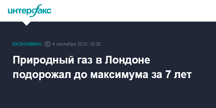 Москва. 4 сентября. INTERFAX.RU - Цены на природный газ с поставкой в зимние месяцы 2018-2019 гг. поднимались во вторник на торгах в Лондоне до максимума за семь лет, 76,45 пенса за терм ($346 за тысячу кубометров) на новостях о том, что выработка британских АЭС в течение отопительного сезона будет меньше обычного.
