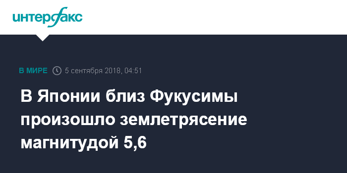 Москва. 5 сентября. INTERFAX.RU - Землетрясение магнитудой 5,6 произошло в Японии в 36 км к юго-востоку от города Фукусима, сообщает Алтае-Саянский филиал Единой Геофизической службы РАН.