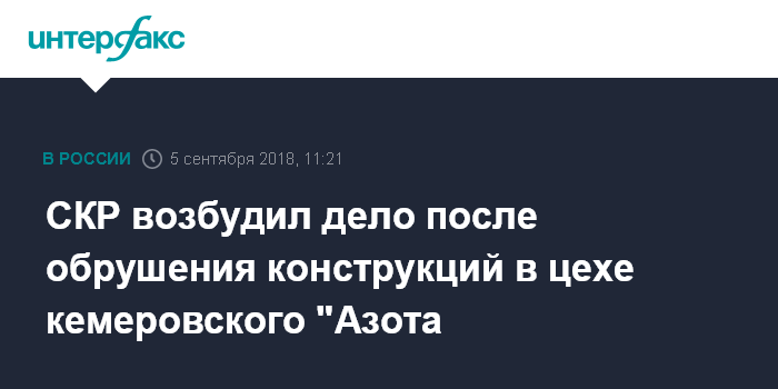 Москва. 5 сентября. INTERFAX.RU - СКР по Кемеровской области возбудили уголовное дело по факту обрушения конструкций в цехе химического предприятия "Азот" в городе Кемерово, в результате которого пострадали три человека, сообщается на официальном сайте ведомства.