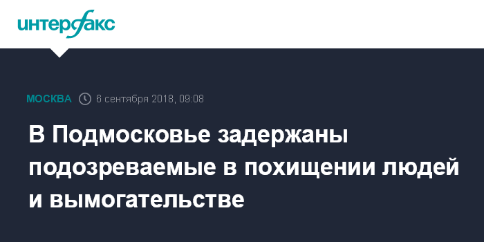 Москва. 6 сентября. INTERFAX.RU - В Подмосковье задержаны подозреваемые в похищении людей, сообщила "Интерфаксу" в четверг официальный представитель МВД Ирина Волк.