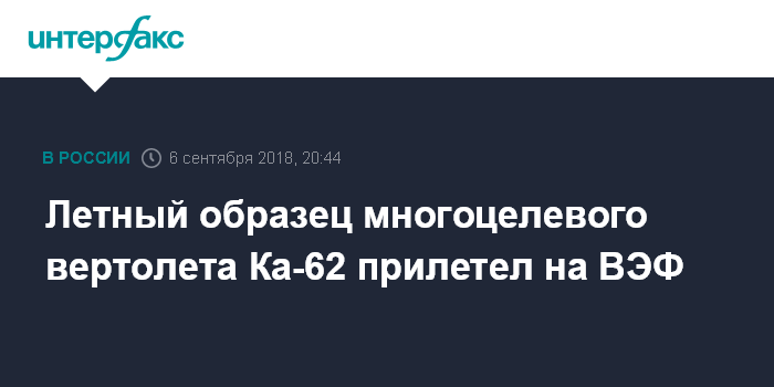 Он отметил, что летный образец Ка-62 уже с серийной трансмиссией совершил свой первый перелет с аэродрома Арсеньевского завода (ААК "Прогресс") во Владивосток, где его представят участникам Восточного экономического форума (ВЭФ).