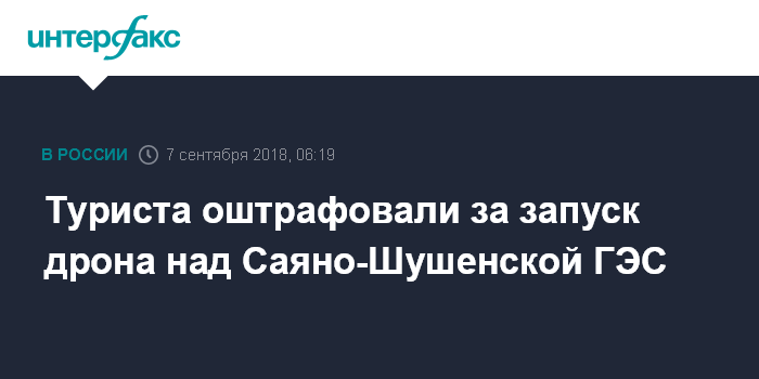 Москва. 7 сентября. INTERFAX.RU - Турист из Красноярска привлечен к административной ответственности и оштрафован на 2 тыс. рублей за запуск квадрокоптера в закрытой для полетов зоне над Саяно-Шушенской ГЭС, сообщает Западно-Сибирская транспортная прокуратура.