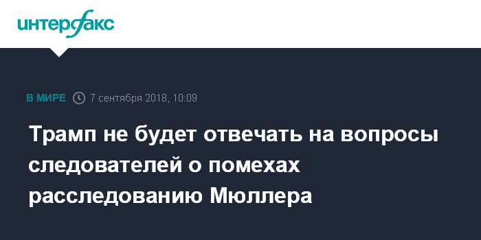 Москва. 7 сентября. INTERFAX.RU - Президент США Дональд Трамп в случае дачи показаний в рамках расследования спецпрокурора Роберта Мюллера о предполагаемом вмешательстве РФ в выборы 2016 года, не намерен отвечать на вопросы о том, пытался ли он препятствовать этому расследованию.