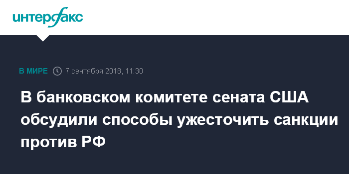 Москва. 7 сентября. INTERFAX.RU - Банковский комитет сената США провел слушания, на которых обсуждались возможные новые санкционные меры против России, сообщает радиостанция "Голос Америки".