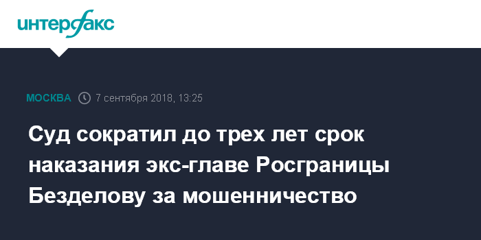 Москва. 7 сентября. INTERFAX.RU - Мосгорсуд пересчитал срок реального лишения свободы осужденному на девять лет заключения за мошенничество бывшему руководителю Федерального агентства по обустройству государственной границы РФ Дмитрию Безделову.