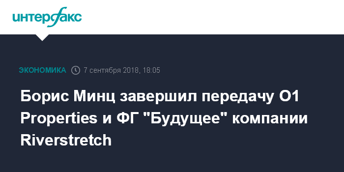 Москва. 7 сентября. INTERFAX.RU - O1 Group Бориса Минца завершила передачу O1 Properties и ПАО "ФГ "Будущее", в которое входят негосударственные пенсионные фонды "Будущее", "Телеком союз", "Социальное развитие" и "Образование", компании Riverstretch Trading & Investments Limited, говорится в совместном сообщении компаний.