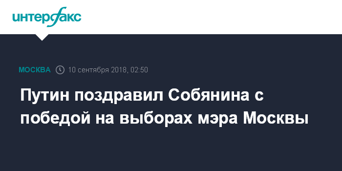 Москва. 10 сентября. INTERFAX.RU - Президент РФ Владимир Путин поздравил Сергея Собянина с победой на выборах мэра столицы.