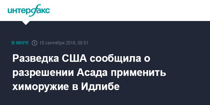 Москва. 10 сентября. INTERFAX.RU - Президент Сирии Башар Асад разрешил правительственным войскам в ходе операции по освобождению от террористов провинции Идлиб применить хлор, сообщила газета The Wall Street Journal со ссылкой представителей американской администрации.