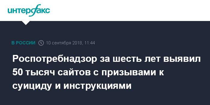 Москва. 10 сентября. INTERFAX.RU - За последние шесть лет Роспотребнадзор выявил запрещенные упоминания о способах самоубийства и призывам к нему по более чем 50 тысячах интернет-ссылок, сообщает пресс-служба ведомства.
