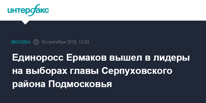 Москва. 10 сентября. INTERFAX.RU - Выборы главы Серпуховского района Московской области, по предварительным данным, выиграл Игорь Ермаков ("Единая Россия"), который набрал 40,68% голосов. Соответствующая информация размещена на сайте Мособлизбиркома.