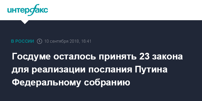Москва. 10 сентября. INTERFAX.RU - В Госдуме посчитали, сколько законов еще нужно принять для полного законодательного обеспечения реализации Послания президента РФ Федеральному Собранию.