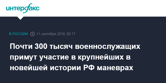 Москва. 11 сентября. INTERFAX.RU - Во вторник стартуют крупнейшие в новейшей истории России маневры "Восток-2018", в которых примут участие почти 300 тысяч военнослужащих из России, Китая и Монголии.