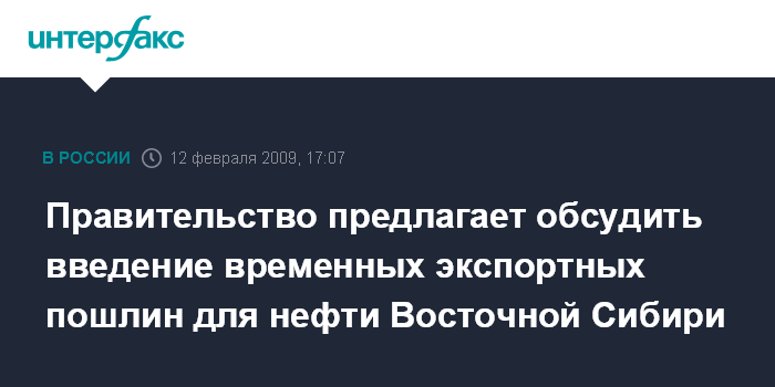 Москва. 12 февраля. INTERFAX.RU - Правительство предлагает обсудить введение временных экспортных пошлин для нефти Восточной Сибири, сообщил премьер-министр РФ Владимир Путин в ходе правительственного совещания по вопросам ТЭК. Он также отметил, что необходимо разработать специальную модель налогообложения для новых месторождений.