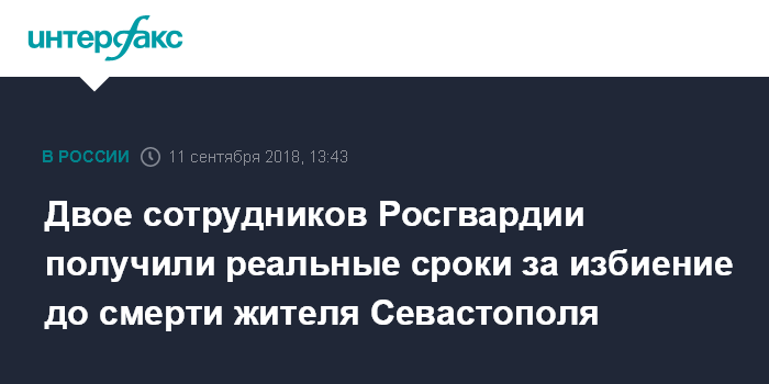 Москва. 11 сентября. INTERFAX.RU - Севастопольский гарнизонный военный суд приговорил двух военнослужащих Росгвардии к 4 и 6 годам лишения свободы в колонии строгого режима, признав их виновными в причинении жителю Севастополя тяжкого вреда здоровью, что привело к смерти потерпевшего, сообщила пресс-служба суда во вторник.