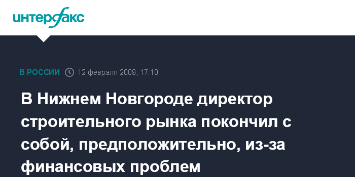Москва. 12 февраля. INTERFAX.RU - В Нижнем Новгороде, предположительно, покончил с собой директор одного из строительных рынков.