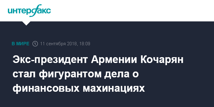 Москва. 11 сентября. INTERFAX.RU - Бывший президент Армении Роберт Кочарян обвиняется в финансовых махинациях и отмывании денег, заявил директор Службы национальной безопасности Армении Артур Ванецян.