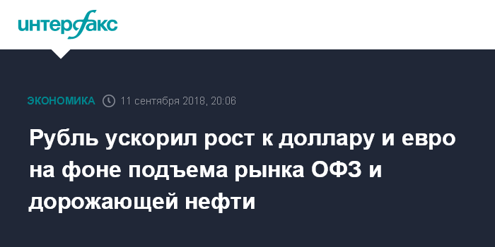 Москва. 11 сентября. INTERFAX.RU - Доллар США и евро ускорили снижение на "Московской бирже" во вторник вечером, рубль укрепляется к бивалютной корзине, отыгрывая первый с конца августа отскок на рынке ОФЗ и уверенно дорожающую нефть.