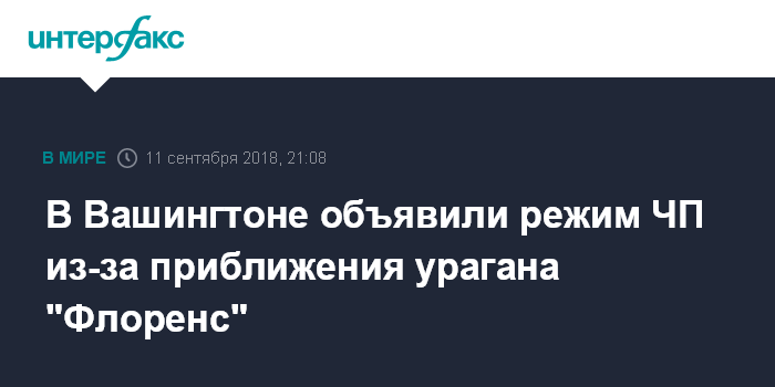 Москва. 11 сентября. INTERFAX.RU - Мэр столицы США города Вашингтон Мюриел Баузер во вторник объявила режим чрезвычайного положения в связи с ураганом "Флоренс", который приближается к юго-восточному побережью США.
