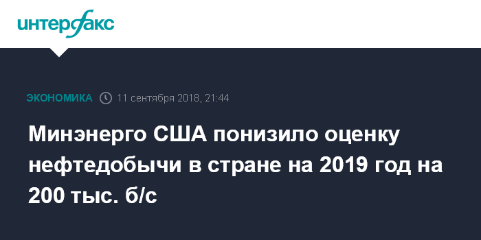 Москва. 11 сентября. INTERFAX.RU - Минэнерго США понизило оценку нефтедобычи в стране в 2019 году с 11,7 млн баррелей в сутки до 11,5 млн б/с, следует из ежемесячных отчетов ведомства.