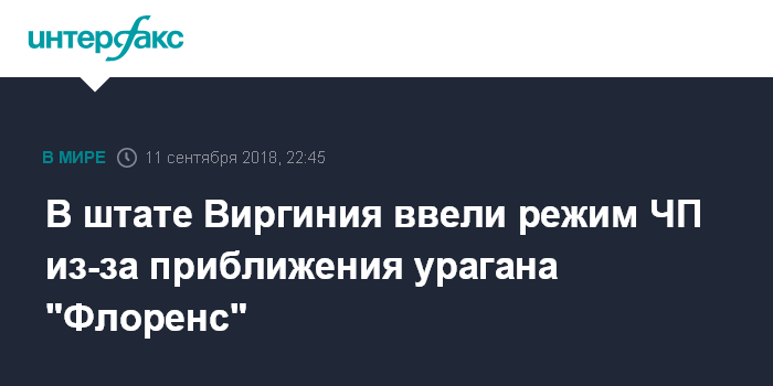 Москва. 11 сентября. INTERFAX.RU - Президент США Дональд Трамп во вторник объявил о введении режима чрезвычайного положения в штате Виргиния в связи с приближением урагана "Флоренс", сообщило американское издание The Hill.