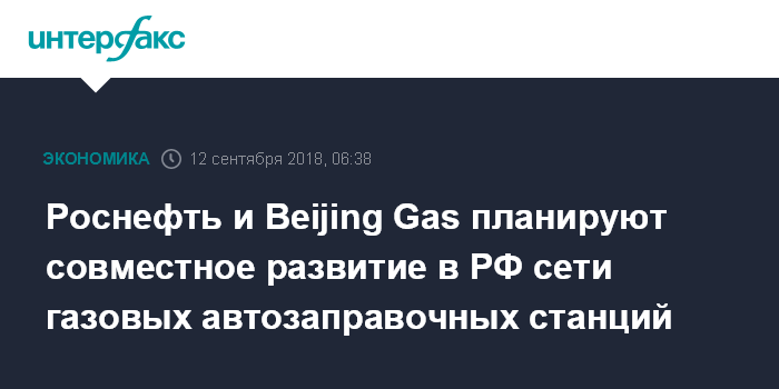 Москва. 12 сентября. INTERFAX.RU - НК "Роснефть" и Beijing Gas Group Company Limited в рамках IV Восточного экономического форума подписали соглашение, закрепляющее основные условия создания совместного предприятия (СП) по строительству и эксплуатации в России сети автомобильных газонаполнительных компрессорных станций (АГНКС).