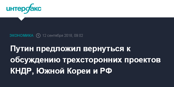 Москва. 12 сентября. INTERFAX.RU - Президент РФ Владимир Путин предлагает вернуться к обсуждению трехсторонних проектов с участием Москвы, Сеула и Пхеньяна, что требует урегулирования ситуации на Корейском полуострове.