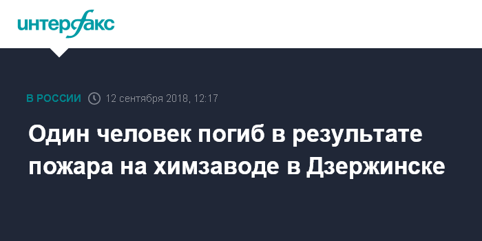 Москва. 12 сентября. INTERFAX.RU - Один человек погиб, еще один получил ожоги в результате возгорания на предприятии "Карбохим" в городе Дзержинске Нижегородской области, сообщает Главное управление МЧС РФ по региону.